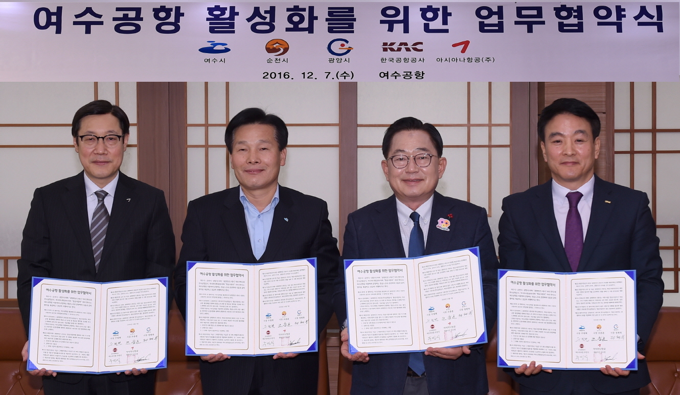 여수시(시장 주철현)는 7일 오전 여수공항에서 순천․광양시와 한국공항공사, 아시아나항공(주)과 함께 여수공항 활성화를 위한 업무협약을 체결했다.