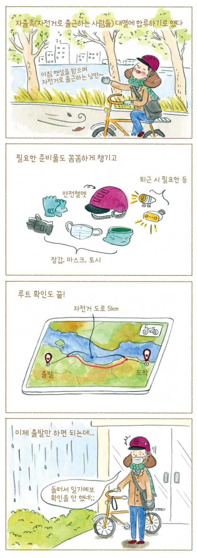 - 미세먼지 경보가 있는 날에는 자전거 출퇴근을 과감히 포기한다.