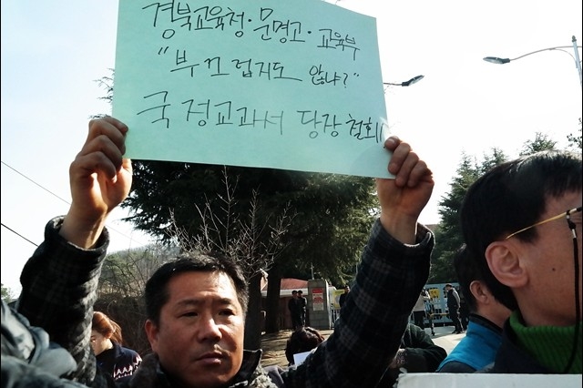 27일 오전 국정화 철회와 연구학교 지정취소를 촉구하는 지역 시민사회의 기자회견이 열리는 동안 문명고에 입학하는 신입생과 학부모 50여명은 학교 입구에서 피켓시위를 벌였다. 이번 국정교과서 사태로 문명고에서만 신입생 2명이 전학 또는 입학포기 신청을 했다.