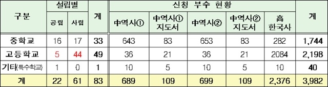 교육부는 지난달 20일까지 전국 중·고등학교를 상대로 국정교과서를 주교재로 사용하기 위한 연구학교 신청을 받았다. 하지만 신청교가 문명고 한 곳에 그치자 교육부는 국정교과서를 보조교재로 활용하기 위한 희망학교 신청을 받았다. 6일 교육부가 발표한 결과에 따르면 2주 동안 공립중 16곳, 사립중 17곳을 비롯해 공립고 5곳, 사립고 44곳, 특수학교 1곳 등 모두 83곳이 신청했다.