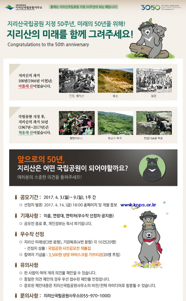 오는 3~9일까지 7일간 진행되는 이번 공모전은 '미래의 지리산은', '지리산의 자연자원 보전을 위한 지리산국립공원의 역할' 등 전 국민의 다양한 목소리를 들을 계획이다.