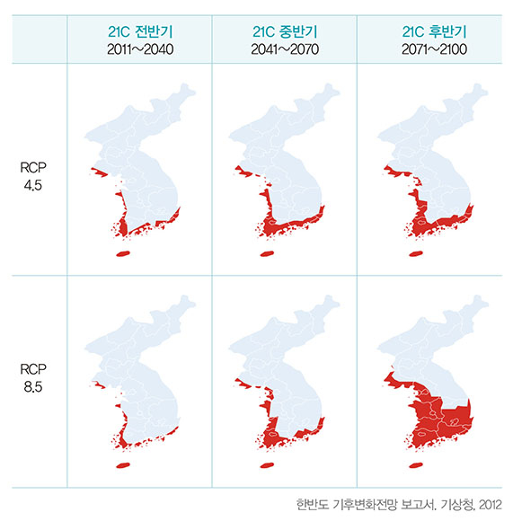 미래의 온실가스 농도경로를 420피피엠(ppm), 540ppm, 670ppm, 940ppm(각각 RCP 2.6 / 4.5 / 6.0 / 8.5)의 4가지 경우로 보고 그에 따라 그려낸 기후변화 시나리오(IPCC 5차 보고서, 2014)를 기초로 기상청이 한반도 기후변화 기본 시나리오와 수자원, 보건, 농업, 재해 등 부문별 응용 시나리오를 작성한 바 있습니다. 현재 각 부처와 기관들은 기상청 시나리오를 기반으로, 각 부문별 응용 시나리오를 추가 작성해 기후변화 적응정책을 펴고 있습니다. 기상청에 따르면, 한반도의 연평균 기온은 RCP 4.5 아래에서 2081~2100년 사이 3.0℃, RCP 8.5 하에서는 5.9℃ 높아질 것으로 전망됩니다. 평균기온의 상승은 열대야 일수와 폭염 일수를 늘리고, 여름이 길어지며 강수 강도와 호우 일수의 증가를 부릅니다. RCP 8.5 하에서 2050년 기준 한반도 연 강수량은 15.6퍼센트 증가할 것으로 전망됩니다. 이러한 강수량 증가는 한반도 전역에 고루 증가하기보다 지역적인 편차가 극심한 형태가 될 것으로 보입니다. 한반도는 점점 더 고온다습한 기후대로 변화하고 있습니다. 한반도가 아열대화하고 있는 것입니다.