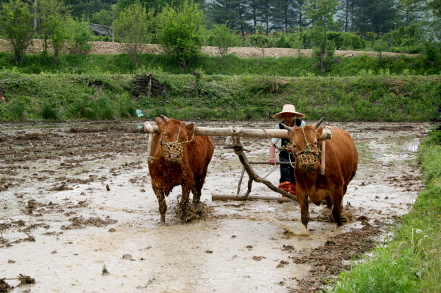 강원 홍천군 동창마을의 한 촌로가 전통 농경방식의 겨릿소 써레질을 재현하는 등 세인의 주목을 끌고 있다.
