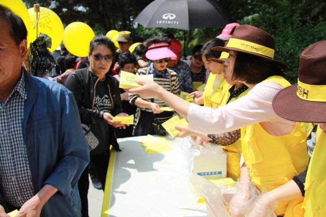 ▲'떡 드세요.' 봉하재단이 마련한 떡과 생수를 나눠주고 있는 자원봉사자들. 하나만 더 달라는 추모객들과 살가운 실랑이도 정겨워보인다.