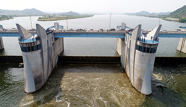 다시 강이 흐르기 시작했다. 5년을 기다린 자연의 법칙이다. 문재인 대통령은 지난달 22일, 4대강 사업으로 건설된 16개 보 중 6개보를 상시 개방한다고 발표했다. 그 결과 1일 오후 2시, 6개의 보 수문이 일제히 열렸다. 4대강 사업은 녹조현상, 생태계 훼손, 물고기의 떼죽음, 강바닥 침전화 등 여러 문제를 야기했다는 지적을 받아왔다. <프레시안>은 이날 수문이 열린 창녕합천보를 찾았다. 5년 만에 물꼬가 트인 낙동강은 어떤 모습일까. 드론을 통해 찍은 사진을 올린다.