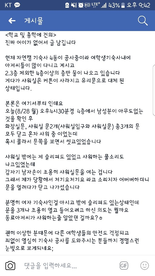 샤워 도중에 봉변을 당한 여대생은 “오늘(8/28) 오후 4시30분경 4층에서 남성분이 아무도 없는 것을 확인 후 화장실문, 샤워실문 2개(샤워실 입구와 샤워실 문) 총 3개의 문을 모두 닫고 샤워 중이었는데 혹시 몰라서 문쪽을 보면서 씻고 있었습니다”라며 “샤워실 밖에는 제 슬리퍼도 있었고 샤워하는 물소리도 나고 있었는데 갑자기 남자 손이 조용히 샤워실 문을 여는 겁니다. 제가 당황해서 저기요 저기요라고 소리치자 어버버하더니 문을 열려다가 닫고 나가셨습니다”라고 당시 상황에 대해 설명했다.