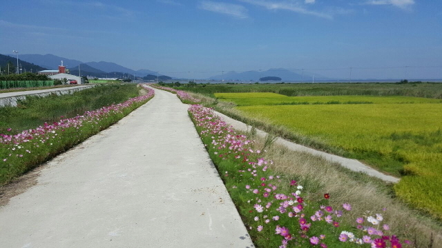 경남 남해군 이동면 무림천 산책로를 따라 활짝 만개한 코스모스가 하늘, 황금들판, 바다와 어우러져 가을의 정취를 전하고 있다.