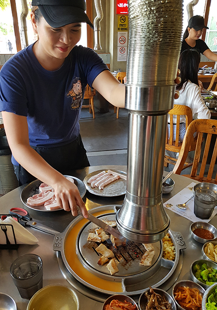 입사 3년차 된 갓(23·여)씨는 “우리 식당은 손님들에게 고기를 한국식으로 먹는 방법을 알려주면서 직원들이 직접 고기를 맛있게 구워주기 때문에 인기가 높다”며 “고기를 간장과 매운 겨자 소스에 묻혀 상추에 싸거나 마늘과 된장을 넣고 싸먹는 탓에 식감이 뛰어나다”고 설명했다.