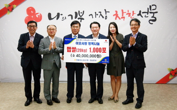 NH농협은행 경남영업본부(본부장 김석균)는 추석맞이“이웃사랑 행복 나눔”실천의 일환으로 지난 12일 경남사회복지공동모금회를 방문하여 2017년산 햅쌀(20kg) 1,000포(₩40,000,000)를 기탁하는 뜻 깊은 행사를 가졌다.