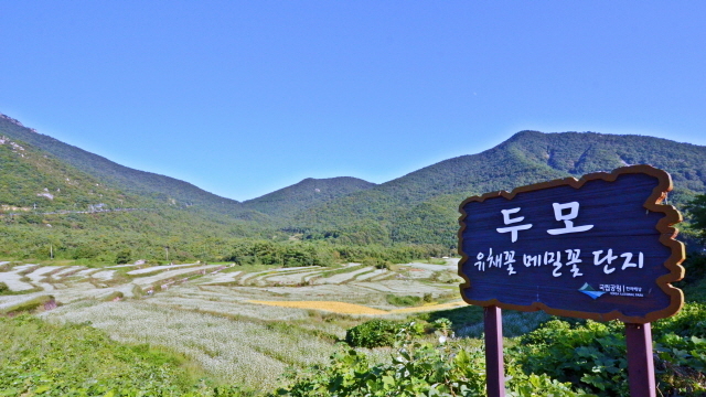 이효석의 소설 메밀꽃 필 무렵인 이 가을, 연인이라는 꽃말을 가진 하얀 메일 꽃물결과 황금빛 들녘이 어우러진 두모마을에서 드라마 도깨비의 명장면을 연출해 보는 건 어떨지.