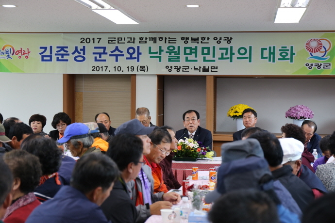한편, 2017년 낙월면민과의 대화는 지난 6월 21일 개최할 예정이었지만, AI 위기경보 ‘심각’ 단계 발령 및 가뭄 위기단계 격상에 따른 재난에 적극 대응코자 한차례 연기된 바 있으며, 이번 대화를 통해 지역의 비전을 위한 현안사업 및 건의사항 등 17건의 의견을 수렴하였다.