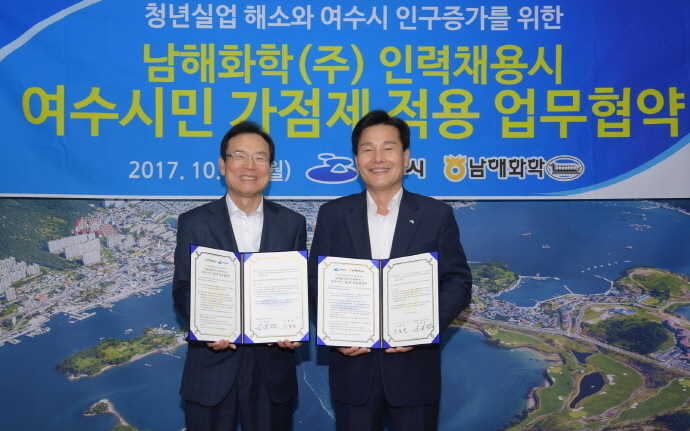 협약에 따라 남해화학은 이후 최초 인력채용부터 여수시민 가점제를 적용하며, 이를 위해 합리적 수준의 가점제도를 수립해 운영할 계획이다.