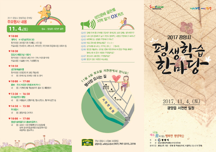 광양시는 시민들의 평생학습에 대한 관심과 욕구를 만족시키기 위해 오는 11월 4일 광양 서천변 일원에서 ‘2017 광양시 평생학습 한마당’을 개최한다.