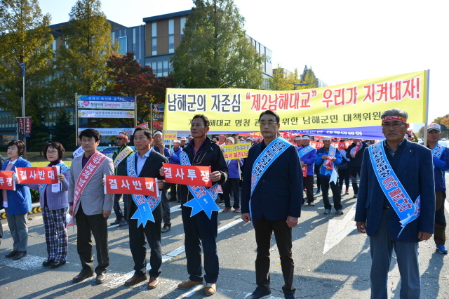 제2남해대교 명칭 관철 남해군민 민관 합동 공동대책위원회(이하 대책위)는 지난 3일 오후 2시 경남도청 광장에서 집회를 열고 남해군과 하동군을 잇는 새 대교의 명칭은 반드시 ‘제2남해대교’여야 한다고 강력히 주장했다.