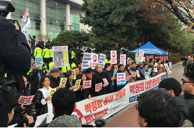 ▲기자회견이 열리자 이들을 비난하는 박 전 대통령 지지자들이 목소리를 키웠다. ⓒ프레시안(이대희)