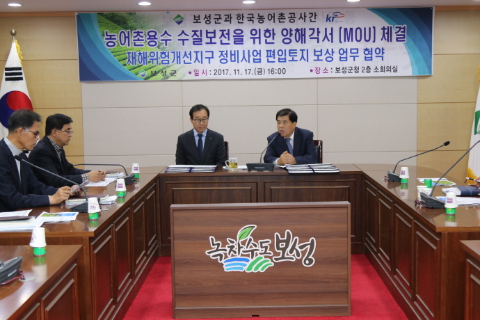 보성군은 지난 17일 군청 소회의실에서 한국농어촌공사 보성지사(지사장 심덕섭)와 ‘농어촌용수 수질보전 업무협약’ 및 ‘보성강1 재해위험 개선지구사업 위·수탁협약’을 체결했다.