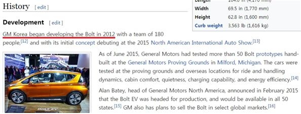 그러다가 <인사이드 경제>는 위키피디아(Wikipedia)에서 흥미로운 내용을 발견했다. 최근 GM이 내놓은 배터리 전기차 쉐보레 볼트(Chevrolet Bolt)를 검색했더니 '한국GM이 2012년부터 볼트 개발을 시작했다'고 나오는 게 아닌가? (위 사진) 사실이었다. 볼트의 디자인 총괄은 스튜어트 노리스 씨로 한국GM 상무이자 디자인센터 책임을 맡고 있다. 디자인에 투입된 180명의 노동자들은 모두 한국 국적의 한국GM 노동자들이다.