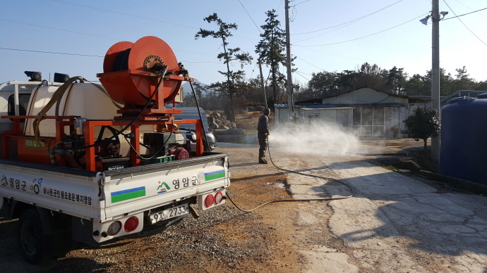 배달시 이용된 차량에 대해서는 농장방문 전후 소독을 실시하여 사용하고, 면사무소 자체 방역팀을 구성해 산불진화장비를 이용 축사 입구 및 진입로, 소규모 사육농가, 철새가 도래한 소류지 및 소하천 등을 방역했다.