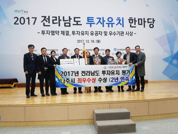 나주시는 18일, 전남도청 왕인실에서 개최된 ‘2017 전라남도 투자유치 한마당’ 행사에서 ▲순수 투자유치 실적(MOU, 분양계약), ▲투자여건 조성(예산 편성·집행), ▲투자유치 사후관리 등 투자유치 관련 평가항목 전반에서 높은 점수를 획득하며, 전남도 내 22개 시·군에서 최우수 기관(3곳)으로 선정되는 쾌거를 이뤄냈다.