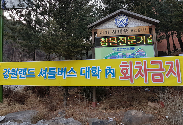 그러자 강원관광대학교는 지난해 3월 강원랜드에 공문을 보내 강원관광대학교 인근 아파트단지에 거주하는 직원들을 위해 운행하는 셔틀버스에 대해 대학교 안으로 진입해서 차량을 돌리지 못하도록 하겠다는 일방적 통보를 했다.