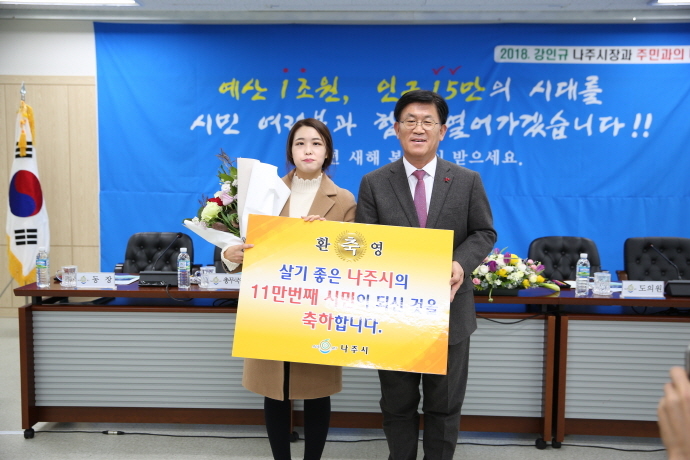 한편 강 시장은 광주 남구에서 빛가람동으로 전입해오며 11만 번째 전입자가 된 김희진(여, 26)씨를 지난 9일, 빛가람동 주민과의 대화 자리에 초청해, 환영식을 갖고 꽃다발을 전달했다.