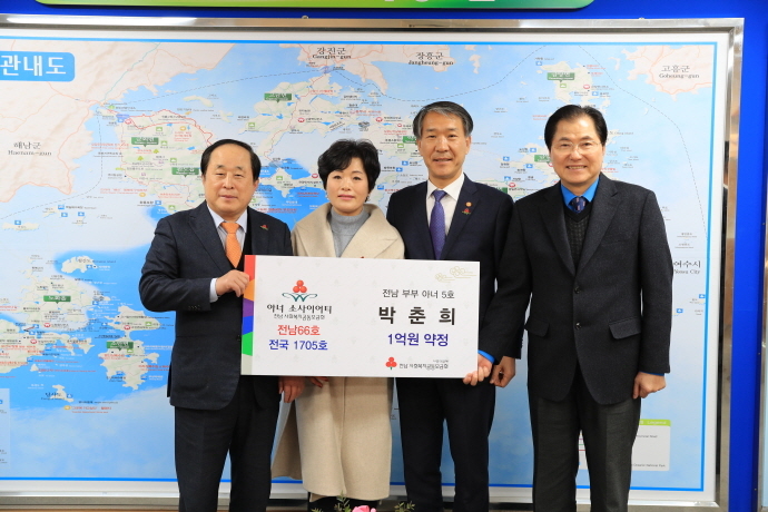 박춘희 여사는 사랑의 열매 전남사회복지공동모금회에 5년동안 1억원의 성금을 기부하기로 약정하기로 하고 가입 서명하여 전국 1705호 아너소사이어티 회원이 되었다.