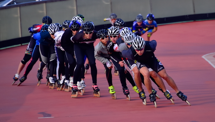▲지난 18일 여수 진남 롤러경기장에서 선수들이 훈련을 하고 있다.