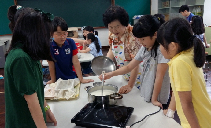 ▲여수시의 노인사회활동에 참여하는 어르신이 초등학교 학생들에게 두부 만드는 법을 가르치고 있다.