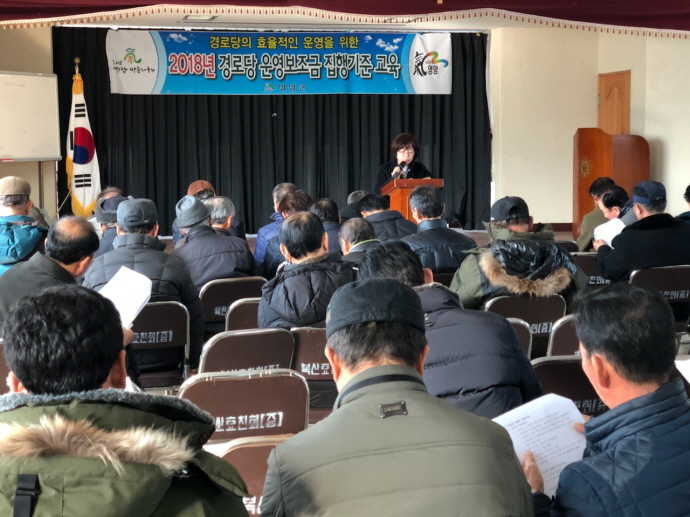 자리를 함께해준 영암군 관계자는 차가운 날씨에도 교육에 참석해주신 경로당 회장, 총무님께 감사의 뜻을 전하며 “지금까지도 잘해주셨지만 2018년에도 경로당 운영보조금 집행 지침을 숙지하시어 투명한 회계지출로 마을경로당이 어르신들의 건전하고 화합된 장소가 되었으면 한다” 고 전했다.