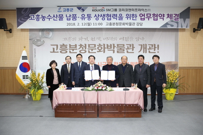 고흥군(군수 박병종)은 지난 12일 고흥분청문화박물관에서 고흥군수를 비롯해 군 관계자와 업체 대표 및 SM그룹 우오현 회장, 코리코엔터프라이스㈜ 고재덕 대표 등이 참석한 가운에 고흥 농수산물 납품·유통 업무협약을 체결하였다고 밝혔다.