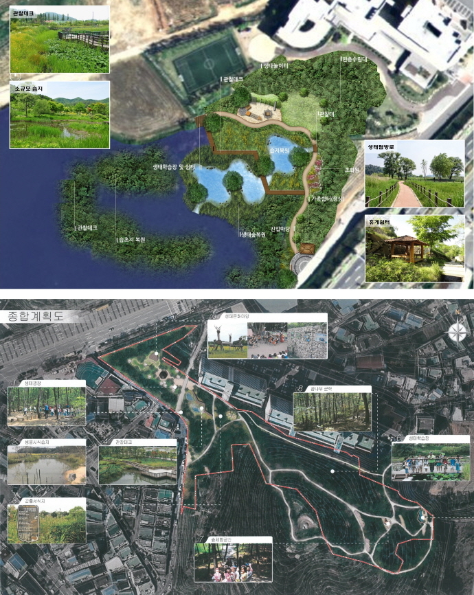 ▲도천2제 저수지 구상도(사진 위), 발산근린공원 구상도(사진 아래)