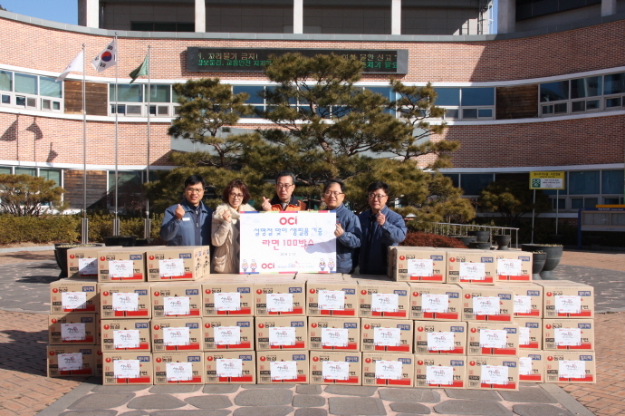 OCI(주)광양공장(공장장 이동률)은 지난 2월 13일(화) 10시 태인동주민센터에서 (재)광양시사랑나눔복지재단(이사장 서경석)에 400만원 상당의 라면 100박스와 생활용품 구입권을 전달했다.