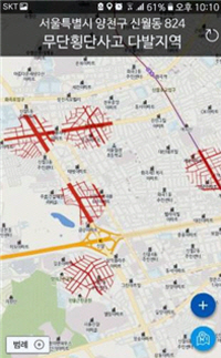 ▲생활안전지도 전국 서비스 모바일 앱에 무단횡단사고 다발지역이 빨간색으로 표시되고 있다.
