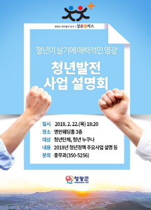 영광군은 지난해 청년고용 확대, 청년능력 개발 등 4개 분야 청년발전 기본계획(2018~2022)을 수립했다. 청년발전 기본계획을 토대로 4개 분야 75개 사업을 포함한 2018년 청년발전 시행계획을 수립하여 추진하고 있다.