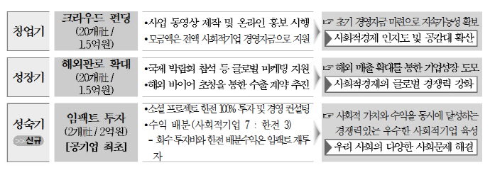 창업기 기업에게는 크라우드 펀딩으로 초기 경영자금을 지원하고, 성장기 기업을 대상으로 해외판로 확대를 통해 해외 매출확대 등 기업의 성장을 도모하고 있으며, 임팩트 투자를 통해 다양한 사회문제를 해결하고, 사회적 가치와 수익을 동시에 달성하는 우수한 사회적기업을 육성한다.