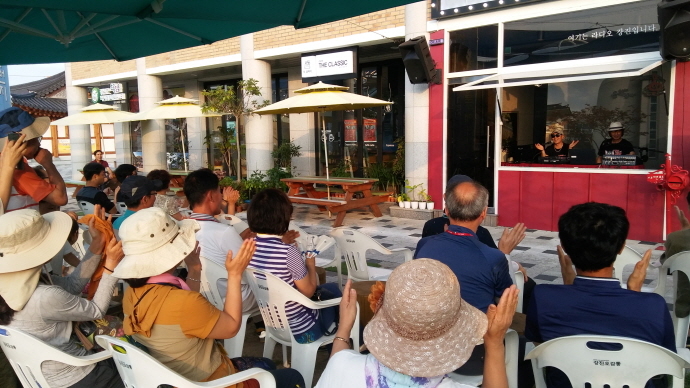 ▲라디오 강진 운영 모습. 강진 오감통을 찾은 관광객들이 라디오 강진 부스 앞 청취석에서 라디오를 듣고 있다. 오감통 전남음악창작소 1층 라디오 스튜디오에서 운영중인 라디오 강진은 매주 토요일 오후 2시에 유튜브를 통해서도 볼 수 있다.