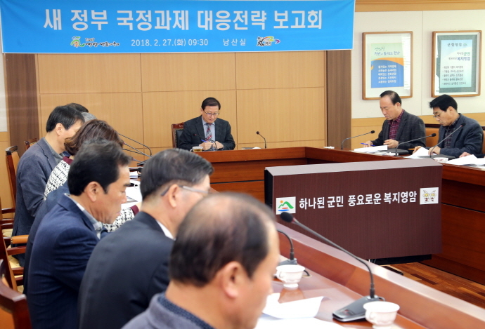 영암군(군수 전동평)에서는 지난 27일 군청 낭산실에서 실과소장 등 관계공무원 30명이 참석한 가운데 새정부 국정과제 대응전략 보고회를 가졌다.