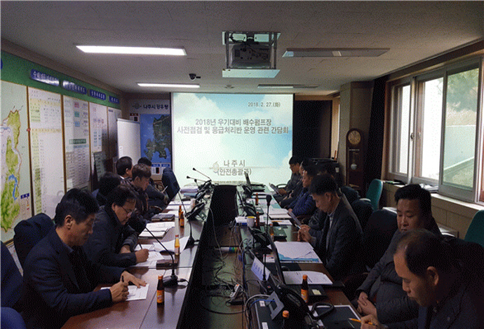 나주시(시장 강인규)는 지난 27일 시청사 재난종합상황실에서 2018년도 우기 대비 배수펌프장 민·관 합동점검 간담회를 개최했다.