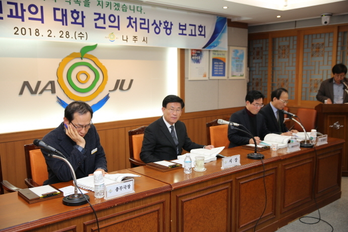 나주시(시장 강인규)가 2018년 읍·면·동 주민과의 대화자리에서 나온 시민 건의사항 총 380건에 대한 ‘추진상황 최초보고회’를 담당 부서장 등 27명이 참석한 가운데 28일 청사 이화실에서 개최했다.