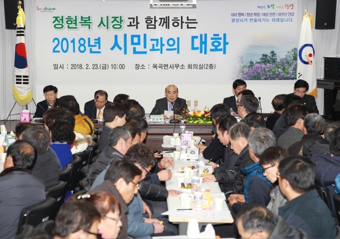 정현복 광양시장이 지난 2월 20일 광양읍을 시작으로 3월 2일 금호동까지 진행된 ‘2018년 시민과의 대화’에서 시민과의 격의 없는 대화와 명쾌한 답변으로 좋은 반응을 얻었다.