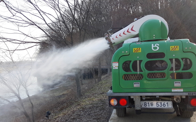 ▲담양군이 감염병 예방관리와 쾌적한 생활환경을 조성하기 위해 축사주변, 정화조, 하수구, 쓰레기장, 하천변 등을 대상으로 해빙기 일제 방역에 총력을 기울이고 있다.