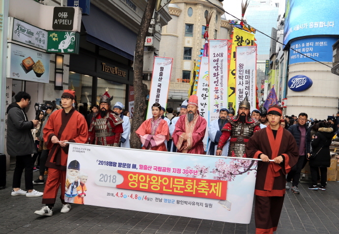 영암군은 지난 9일 서울 명동거리 일원에서 ‘2018 영암왕인문화축제’ 개최를 알리는 홍보 캠페인을 펼쳐 관광객들의 이목을 집중시켰다.