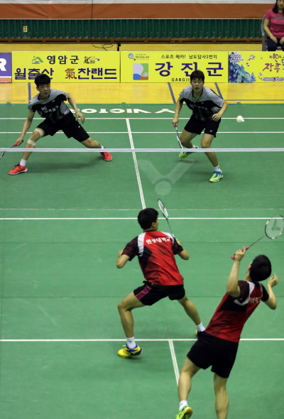 ▲지난해 6월 전남 강진군 강진국민체육센터에서 제 60회 여름철종별배드민턴선수권대회에서 선수들이 혼신의 힘을 다해 경기를 펼치고 있다.