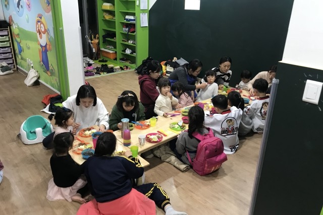 마침 같은 시기에 내가 사는 아파트 단지 관리동 1층에 '수눌음육아나눔터'(제주 고유의 수눌음(품앗이) 정신을 활용하여 공적, 사적 돌봄 공백의 사각지대를 해소하고 지역공동체를 회복을 목표로 2017년까지 20호점이 개소하였고 올해까지 전 읍면동 설치를 목표로 갖고 있다)란 곳이 생겼다. 제주도에서 처음 생긴 1호점이란다. 이웃이 아이들을 함께 돌보고 육아 경험과 정보를 나누자는 좋은 취지를 가진 공간이 생기니, 우리는 자연스럽게 공동육아라는 것을 시작하게 되었다. 공동육아가 뭔지는 잘 모르지만, '어쨌든 같이 모여서 즐겁게 아이를 키워보자'며 우리는 그렇게 뭉쳤다. 팀 이름도 '한 지붕 열 가족'이라고 지었다.
