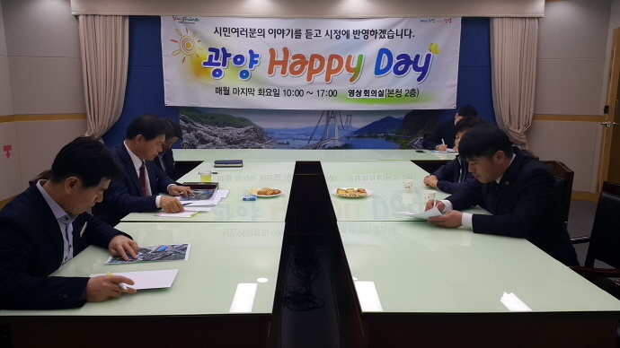 광양시 민선6기 대표 소통 시책인 광양 해피데이는 지금까지 총 40회, 1,417명의 시민들이 방문해 773건의 다양한 민원사항 및 시정발전 제안사항을 건의하며, 시민 소통창고 역할을 톡톡히 해내고 있다.