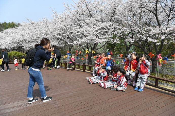 완연한 봄 날씨가 찾아온 3일, 광양제철소가 위치한 금호동에 벚꽃이 만발했다. 금호동은 봄이면 하얀 벚꽃으로 뒤덮여 꽃 구경을 온 사람들로 북적 인다. 특히 이날은 꽃망울을 활짝 터뜨린 광양제철소 백운대 벚꽃터널로 산책을 나온 어린이들이 모여 사진을 찍고 있다. 한편, 이번 벚꽃 기간 동안 약 만 명의 사람들이 백운대 가로수길을 방문했다.
