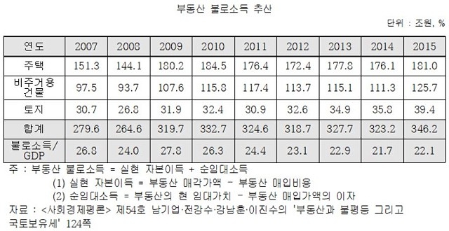 그렇다면 불로소득은 대체 얼마나 발생한 걸까? 위의 표에 의하면, 2007~2015년 우리나라의 부동산 불로소득은 2년을 제외하고 매년 300조 원 이상 발생(GDP의 21% 이상)했고, 2015년에는 무려 346.2조 원의 소득이 발생했다. 이 소득은 생산과 기여에 대한 결과가 아니므로 결국 다른 사람의 노력 소득을 이전시킨 것인데, 관건은 과연 누구의 노력 소득이 침범을 당했느냐는 것이다. 당연히 토지를 소유하지 못한 하위계층이다. 다시 말해서 매해 300조 원이 넘는 하위계층의 노력 소득이 토지를 과다하게 보유하고 있는 상위계층에게로 '합법적으로' 이전되고 있다는 것인데, 우리는 여기서 소득 불평등의 주된 원인이 바로 토지 불로소득임을 유추할 수 있게 된다.