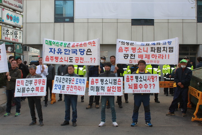 자유한국당 경북 의성군 당원 30여명은 자유한국당 경북도당 공천관리위원회가 6.13지방선거 출마 후보자로 김주수 현 의성군수를 단수 추천하자 이에 반발, 지난 11일 오후 서울 여의도 자유한국당 중앙당 앞에서 항의집회를 열었다.