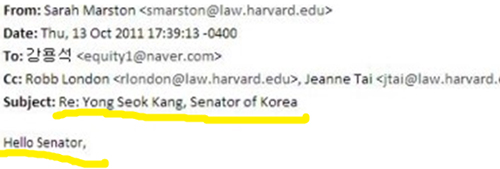 | ▲ 강용석 의원이 공개한 하버드 로스쿨 쪽으로부터 받은 답변 메일. ⓒ프레시안 |