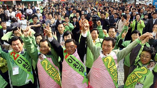 | ▲ 왼쪽부터 민주당 김진표 의원, 정세균 대표, 이찬열 후보, 손학규 전 대표, 한명숙 전 총리 ⓒ뉴시스 |